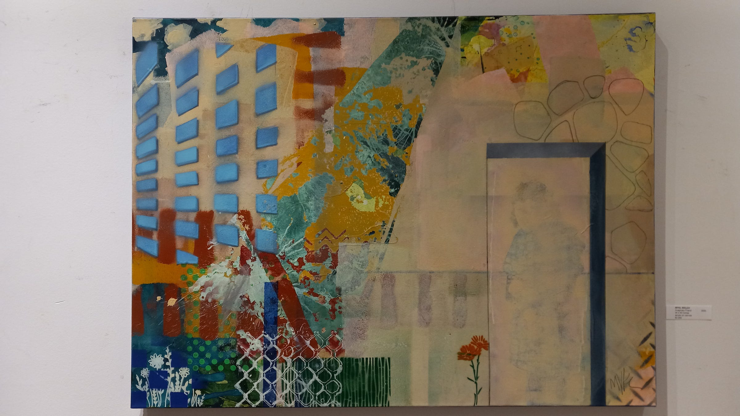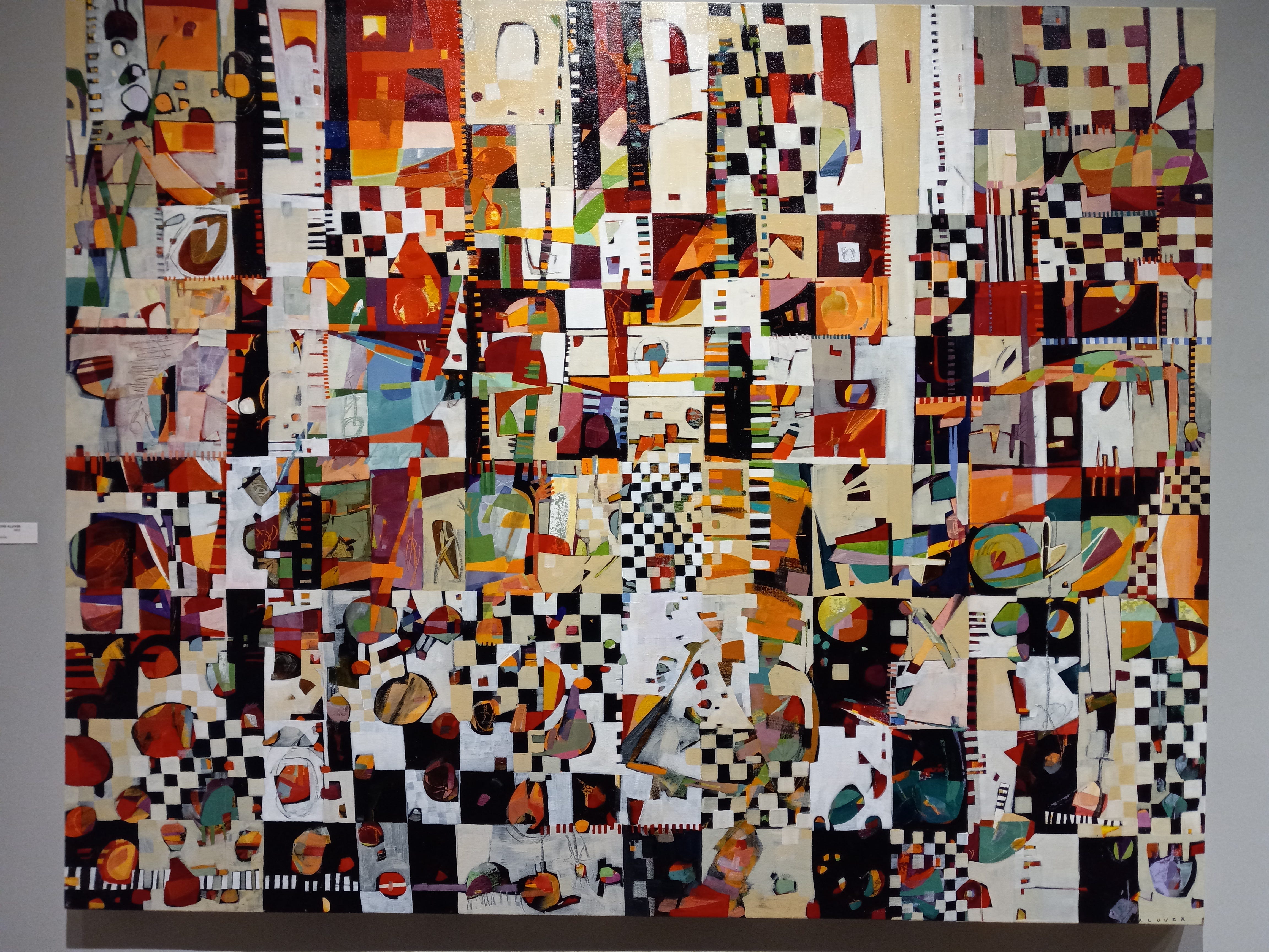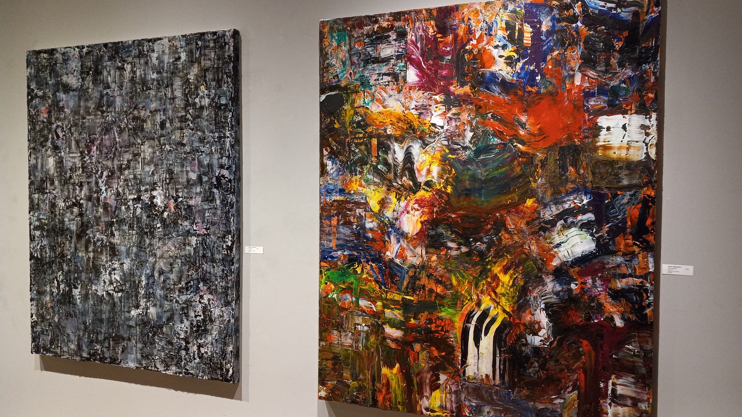 The works on display at Modern Arts Midtown are, in a similar fashion, reflective of the pace of life in Omaha, with their kaleidoscopic variety of surfaces, forms, organizational structures. These days the communicative power of paintings has become more allusive and ambiguous; abstraction still reigns as the dominant mode in painting—yet far from being examples of the “zombie formalism” censured by Jerry Saltz, the pictures here are full of individuality, life, and a relentless, positive energy. They match precisely the mood I get when I think of my city, growing and stretching and flexing its muscle. Will we see an “Omaha Golden Age” of painting which will eventually be written about in art books? Who knows! We can surely hope, though!