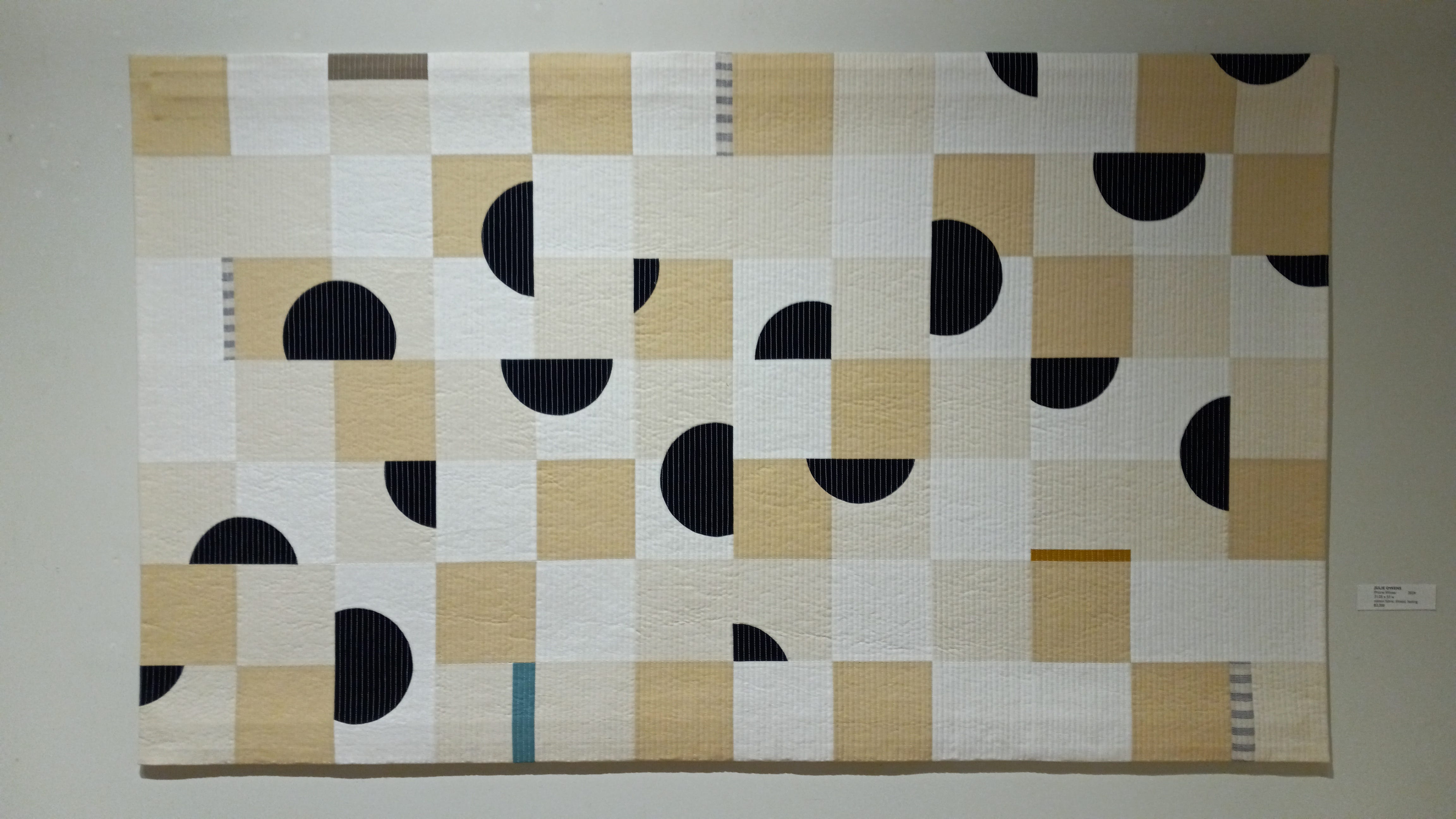 The only works I was not fond of were the dot-patterned textiles by Julie Owens. Perhaps Damien Hirst has simply ruined the idea of polka dots for me—that’s my fault, not that of Owens. Her color palette was much more harmonious, much less ecumenical, than that of Mads Anderson or Mykl Welch; this, coupled with her more regulated and rhythmic spatial organization, felt like a scaling back of the furious energy present elsewhere in the show.
