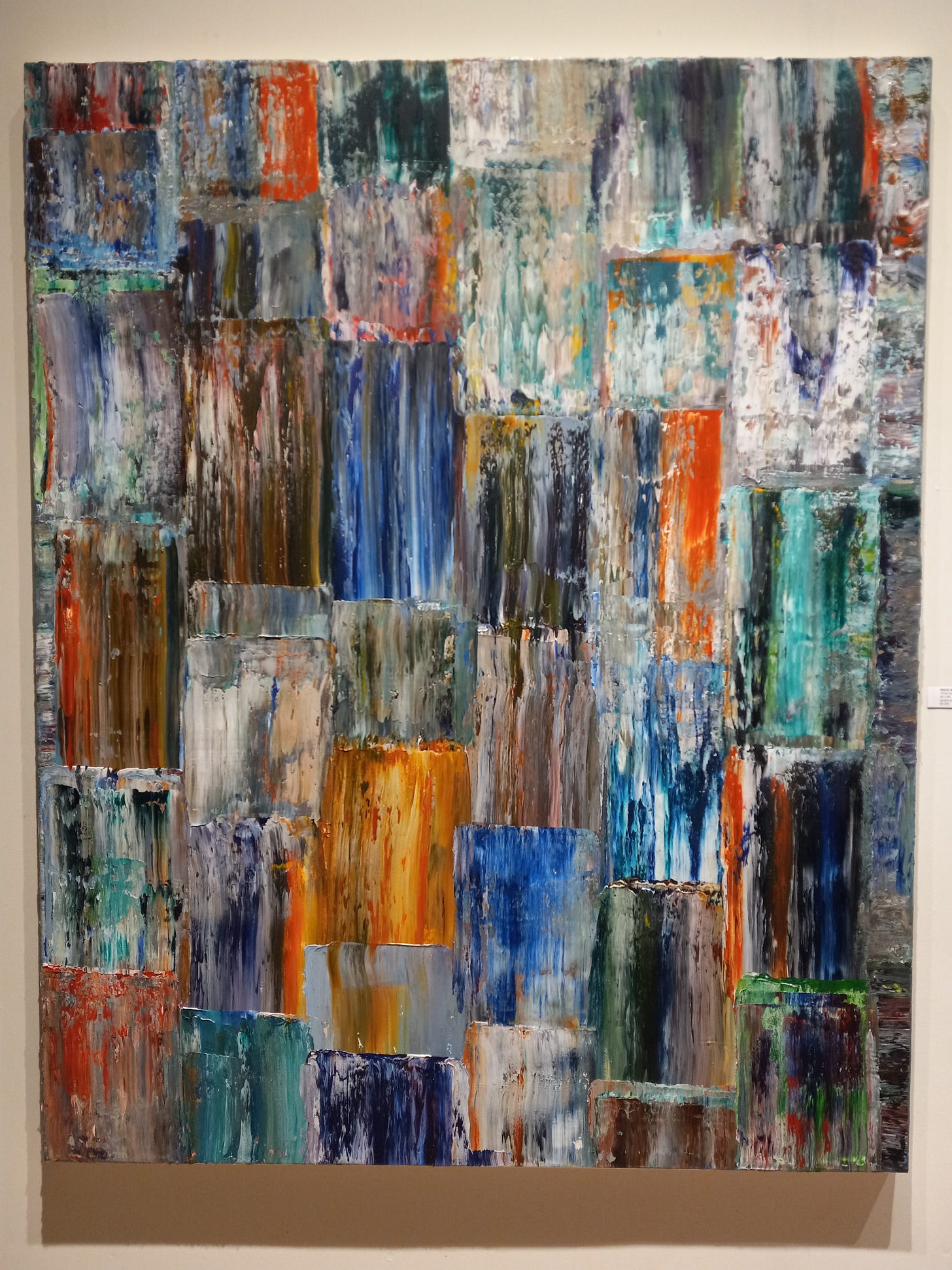 Anderson’s artist statement indicates that he “seek[s] to address duality” through his art, and it’s fair to ask if that claim is supported in his work. I think it is; each painting of his seemed to be defined by a larger formal structure made of minuscule units. Take The Mist, shown above, for example: at first glance it is not much more than a large gray rectangle, but a closer looks reveals its texture of multitudes of tiny marks made by brush and palette knife. This tension between the overall effect of his canvases and their individual component parts—the tension between the One and the Many, that eternal bugaboo of western philosophy—gives Anderson’s paintings a conceptual depth which is quite pleasant to behold and experience.
