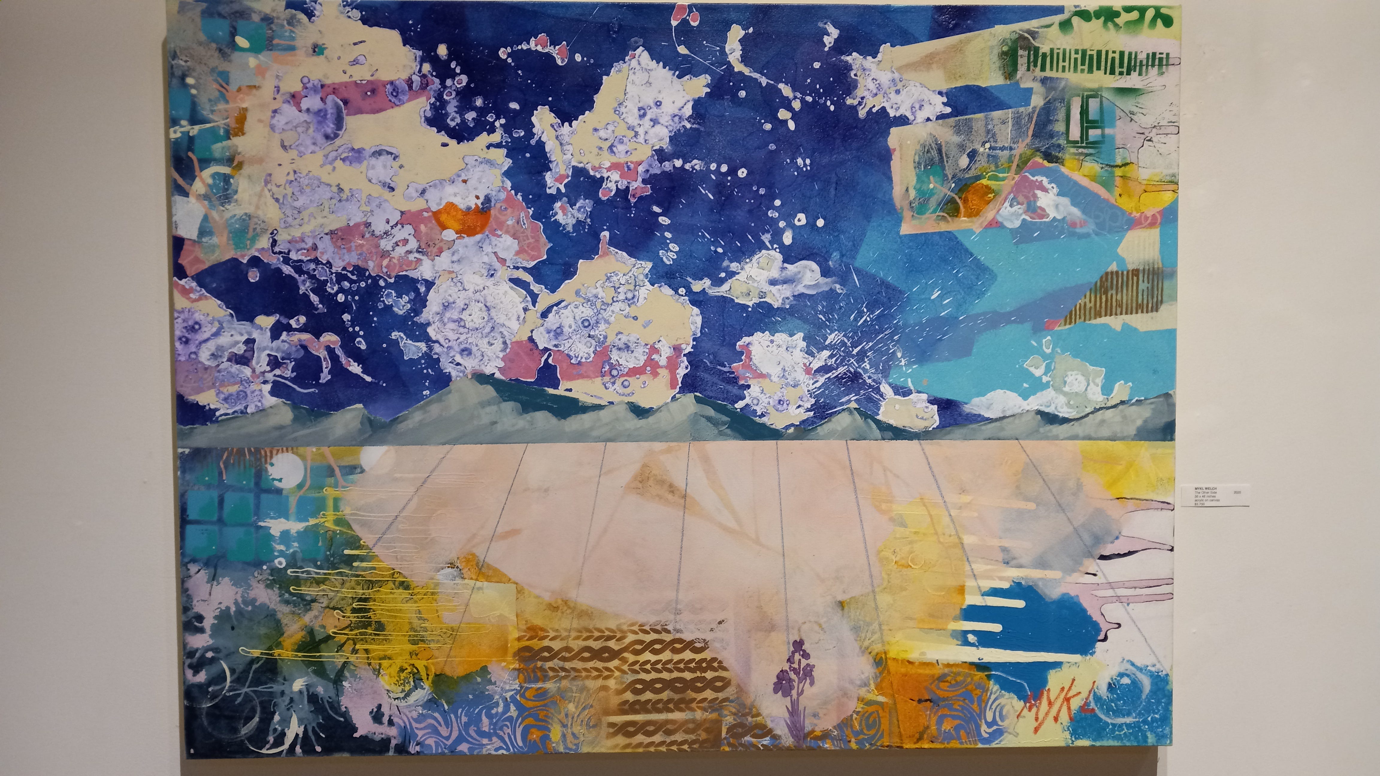 My favorite pieces were by Mykl Welch. They display a mesmerizing depth of detail and a panoply of colors, textures, and forms. These pictures evoke a bug’s-level view of the universe, with organic-seeming plantlike passages juxtaposed with grids that recede into the distance. The sense of scale is both microscopic and vast. Some of these paintings evoke the limitless vistas of prairie and sky, or maybe suburban sprawl; others layer colors and forms to claustrophobic densities, compelling the viewer to slow down and examine each square inch of the painting with close scrutiny.