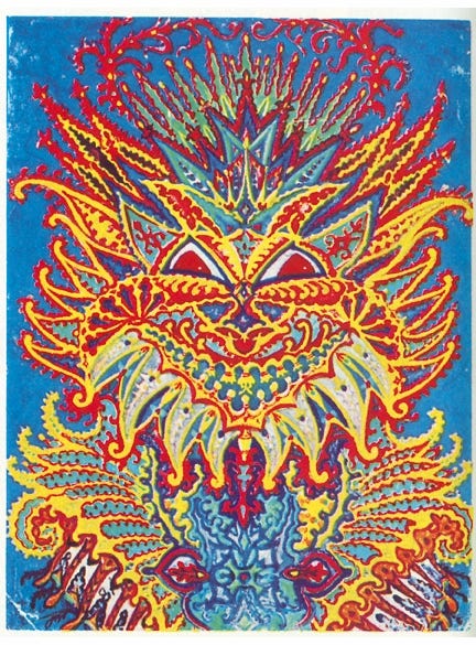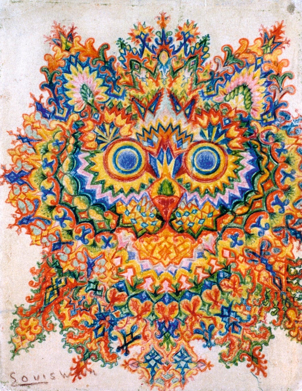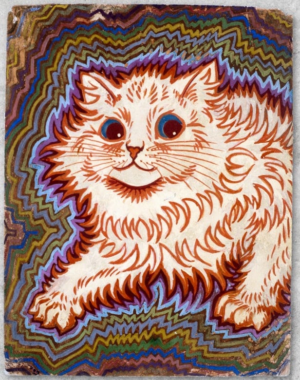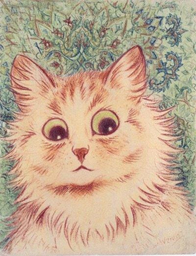 This cat, calmer than the previous two, is somehow more terrifying to behold: it has transcended this earthly plane and become a being of pure energy, fully detached from the realm of mere matter. Actually that’s how most cats seem to behave—like disdainful deities; as if the world isn’t good enough for them. It seems Wain has expressed, in his art, a fundamental truth about cats.
