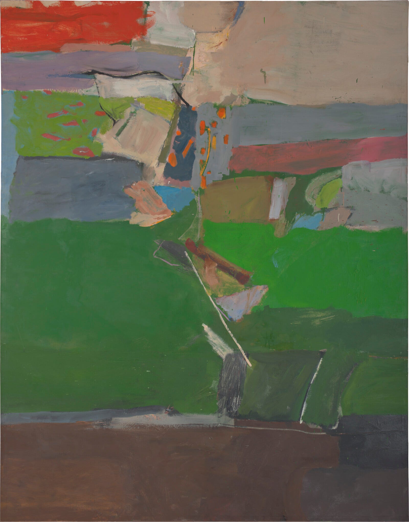 Ingleside. 1963. Diebenkorn, looking out at a landscape, sees colors and planes. The amount of detail in the foreground is the same as that of the background; there is therefore barely any three-dimensional space in this picture, despite our eyes “knowing” there ought to be.