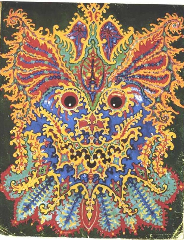 Early-twentieth-century England was, like our own time, besotted with cute animals doing funny things. The paintings and drawings of Louis Wain (mostly depictions of anthropomorphized cats acting like humans) were immensely popular in Edwardian England. Wain himself was not a shrewd businessman; he failed to secure the copyright on most of his works and therefore remained in poverty throughout his life. He also suffered many nervous breakdowns and was eventually committed to a mental hospital. He continued making works of art while at the hospital; in 1939, the psychologist Walter Maclay found several of his images of cats in a junk shop and proclaimed they evidenced Wain’s deteriorating grasp on reality as he descended into madness. Since it is impossible to sequence the images with certainty (Wain didn’t date or title any of the works he made during his latter years), Maclay’s theory remains conjectural; but perhaps instead of evidence of increasing mental debility, Wain’s pictures could be seen as a record of the artist’s sharpening focus? Wain’s cats were always full of verve and spunk—his work could be read as a progressive refinement of his technique as he drew cats that were more and more electrified until, in the end, they become creatures of pure energy. During the day cats are notoriously slothful, spending much time lolling about in sunbeams; but at night their energies are released and they run around the house with wild abandon. How to describe this in paint? Wain’s pictures do so remarkably well.